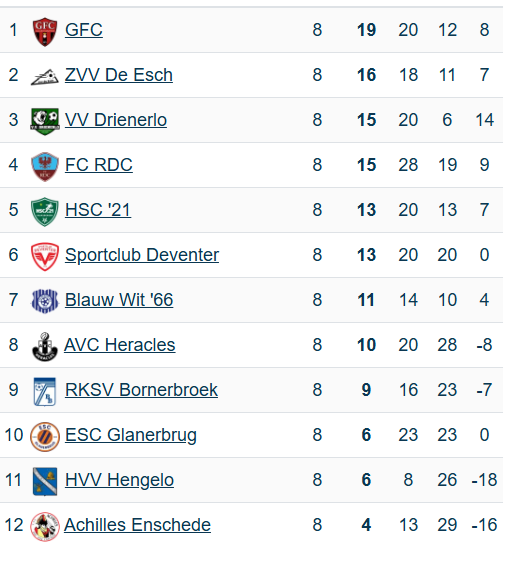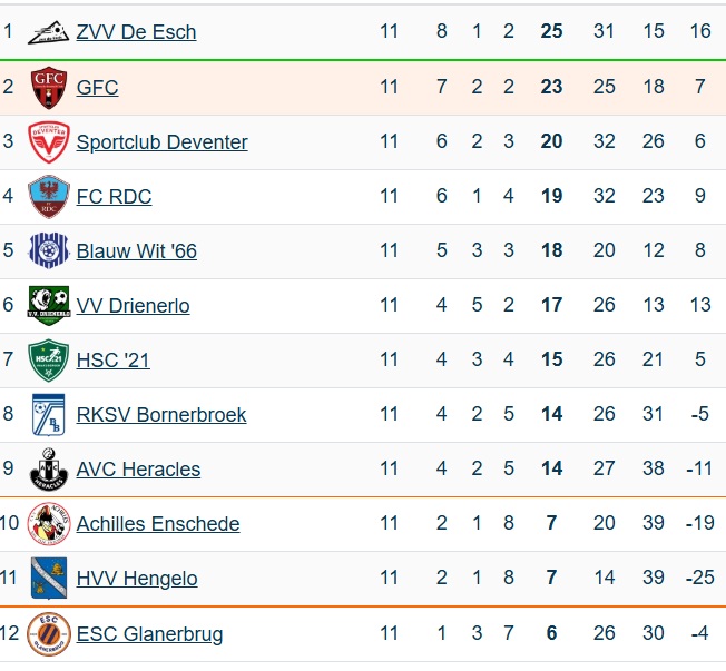 De winterstop is begonnen en GFC gaat als de nr. 2 het nieuwe jaar in. De Esch is “herbstmeister” en heeft 2 punten meer. GFC verloor twee keer tot op heden, thuis van De Esch (2-4) en de uitwedstrijd bij Blauw Wit (4-1). Het doelsaldo van GFC is 25-18. Feit is dat GFC de 1e periode heeft gewonnen en dat betekent dat de eerste prijs binnen is.